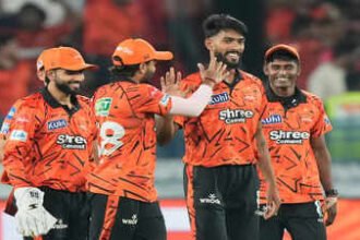 Sunrisers Hyderabad's Praful Hinge, centre, celebrates the wicket of Rajasthan Royals' Vaibhav…