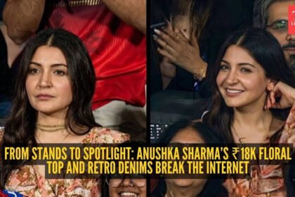Anushka Sharma captivated at IPL 2026, pairing an ₹18K floral Sézane blouse with relaxed bell-bottom denims. This chic, high-low mix…