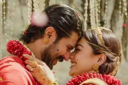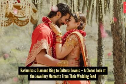 The brideRashmika wore a rust-red saree rich in antique gold embroidery and temple-inspired motifs. Her layered temple jewellery added a…