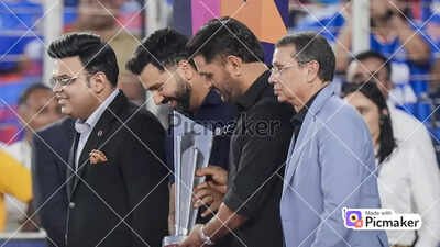 Rohit Sharma and MS Dhoni brought out the trophy at the ICC Men's T20 World Cup final in Ahmedabad on…