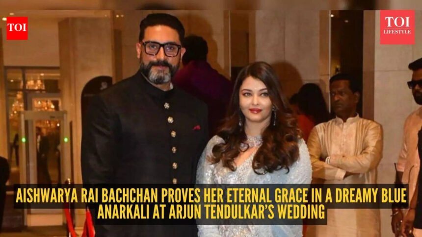 Aishwarya Rai Bachchan doesn’t step out very often these days. But when she does, people notice. And somehow, the moment turns into a fashion conversation almost instantly.That’s exactly what happened on March 5 in Mumbai, when Aishwarya arrived with Abhishek Bachchan at the wedding of Arjun Tendulkar and Saaniya Chandhok. The couple’s appearance quickly caught the attention of photographers and guests outside the venue. Partly because they don’t make too many public appearances together anymore. But also because they looked so effortlessly put together.Aishwarya chose a powder-blue anarkali by Manish Malhotra. Soft, flowing and quietly dramatic. The kalidar silhouette moved beautifully as she walked, and the delicate floral Jamali embroidery shimmered under the lights. Inspired by Pachchikari-style detailing, the embroidery added texture without overpowering the look.And it felt very Aishwarya. Elegant, graceful, and never trying too hard.Her styling stayed classic. Soft curls framing her face, that signature red lipstick she has made her own over the years, and diamond jewellery that added just enough sparkle. She also carried a statement silver-toned bag that worked perfectly with the intricate embroidery on her outfit.Abhishek kept things simple but sharp. He showed up in a well-fitted black sherwani, clean and understated. Nothing flashy. And it worked. Standing beside Aishwarya, the two looked perfectly in sync – polished, calm, and comfortable in their style.They paused briefly for pictures before heading inside, smiling at the cameras and greeting a few guests. And within minutes, their photos were already making the rounds online.The Bachchan presence didn’t end there. Amitabh Bachchan and Jaya Bachchan were also spotted arriving at the celebration, bringing a bit of old-school Bollywood charm to the evening.The wedding itself has been one of the most talked-about social events in recent weeks. Arjun Tendulkar, son of cricket legend Sachin Tendulkar and Anjali Tendulkar, married Saaniya Chandhok, granddaughter of hospitality entrepreneur Ravi Ghai. The celebrations followed a series of pre-wedding events in Jamnagar and Mumbai, drawing a mix of cricket stars, film personalities and well-known business families.But amid all the glamour and big names, Aishwarya’s appearance stood out in its own quiet way.She may not be seen at every event anymore. But somehow, every time she steps out, people are reminded why she still holds that timeless aura. Some things just don’t fade. And Aishwarya Rai Bachchan’s grace is clearly one of them.